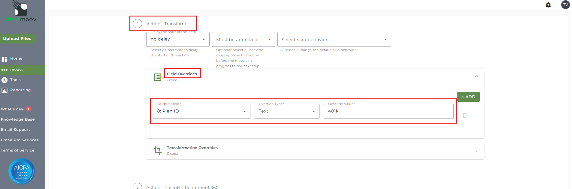 NOTE: There are 3 separate Transform steps on the Alerus Deduction Feedback to PrismHR moov. Make sure are you creating the field override on step 4 - Action Transform.