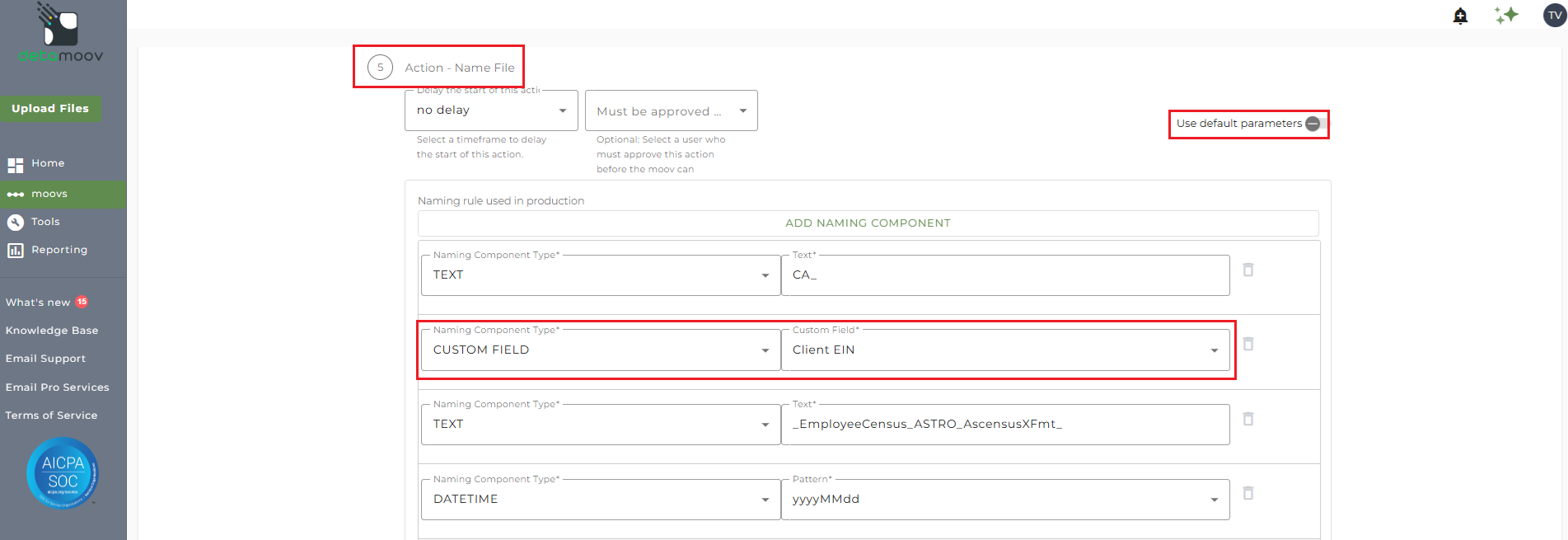 To add a file name override, locate the Action - Name File step and toggle the 'Use default parameters' off. In the Client EIN field change the Naming Component Type to Text and enter in the Company EIN without dashes.