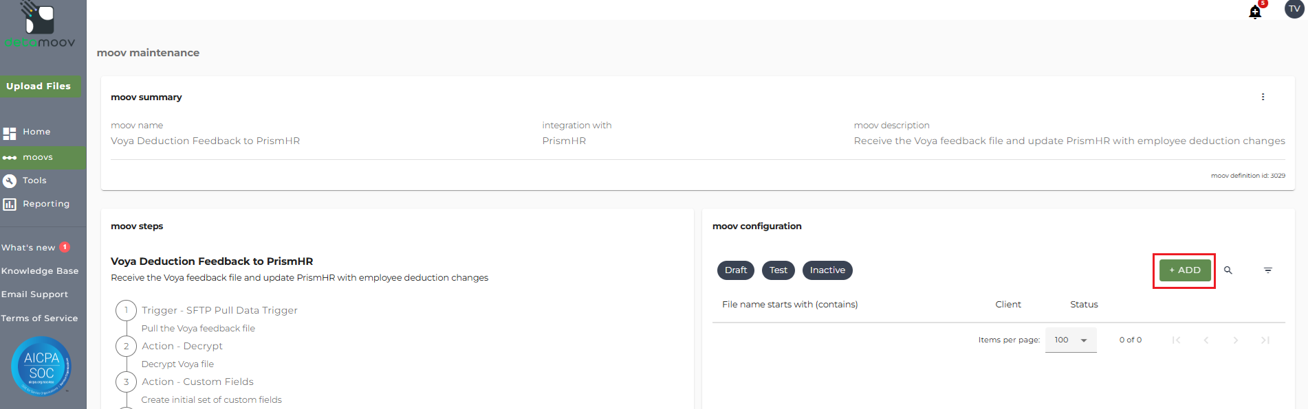 To adopt the Voya Deduction Feedback Split by Location Code moov, click on the moovs option on the left and click the Add button in the upper right.