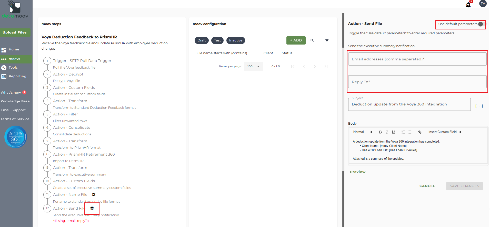The Voya Deduction Feedback to PrismHR moov provides a notification once the moov is complete with a summary of the retirement plan and loan changes that were made in PrismHR. The notification can be sent to any email address you wish and can also be configured to send to multiple email addresses.