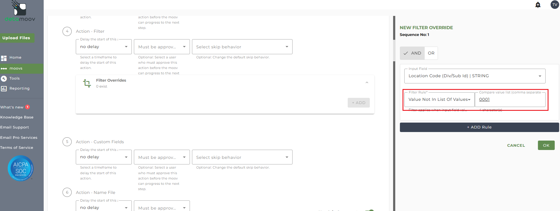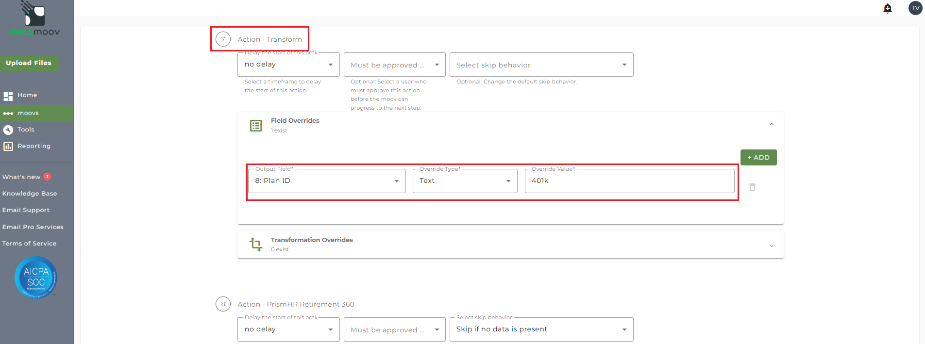NOTE: There are 3 separate Transform steps on the Voya Deduction Feedback to PrismHR moov. Make sure are you creating the field override on step 7 - Action Transform.