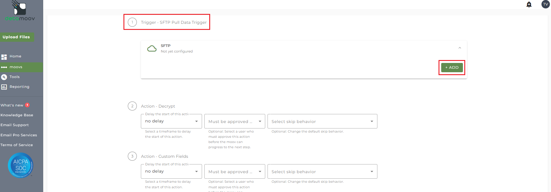 To automate the 360 integration, configure the SFTP schedule. Click the SFTP banner under the Trigger - SFTP Pull Data Trigger step and click Add.