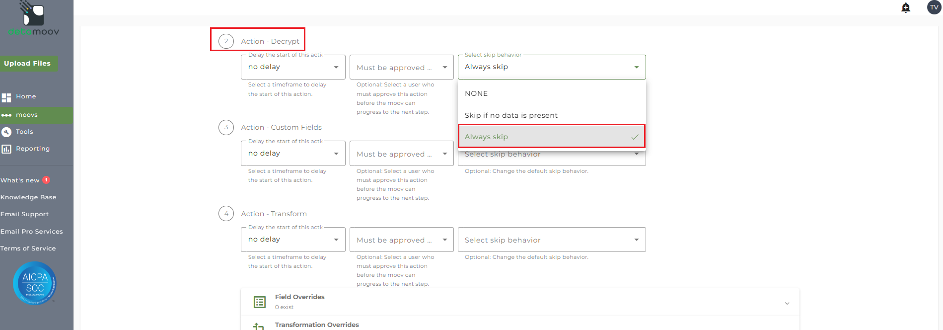 The Voya Deduction Feedback Split by Location Code moov decrypts the Voya feedback file. Since decryption is already done on the Voya Deduction Feedback Split by Location Code moov, you will need to set the 'Select skip behavior' dropdown to 'Always skip'.