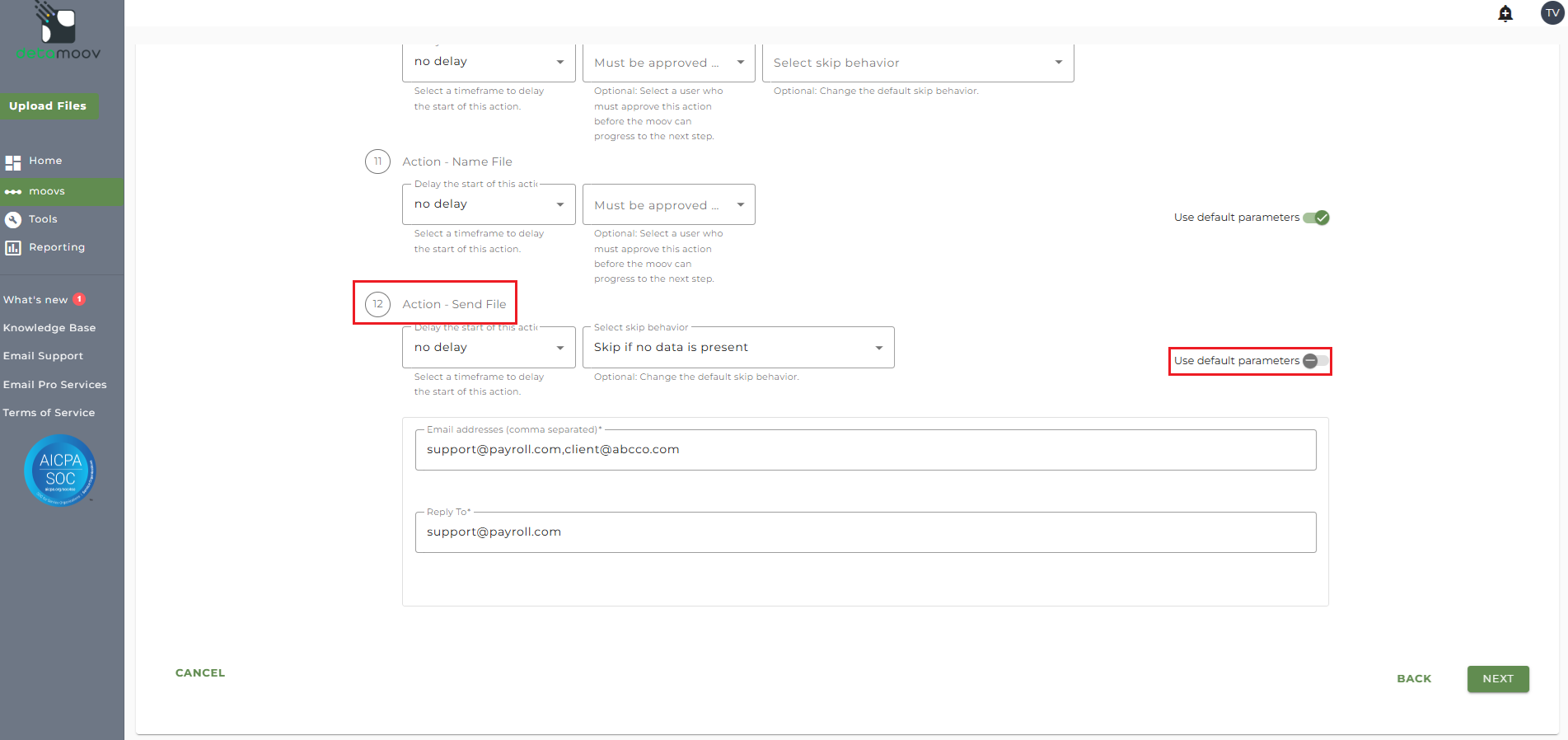 Note: these settings apply to any client configuration you set up for this specific moov. You also have the ability to configure the send file step for each client configuration if you wish to add or remove email addresses per client.