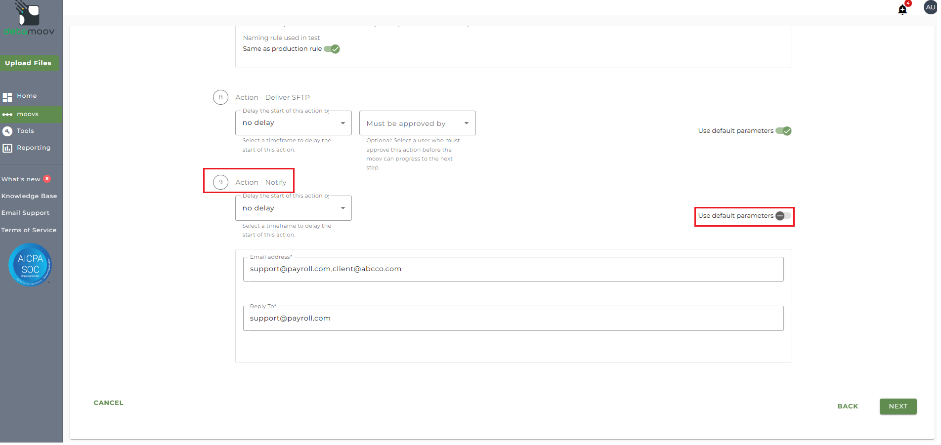 Note: these settings apply to any client configuration you set up for this specific moov.  You also have the ability to configure the notification step for each client configuration if you wish to add or remove email addresses per client.