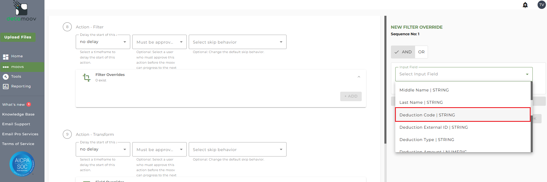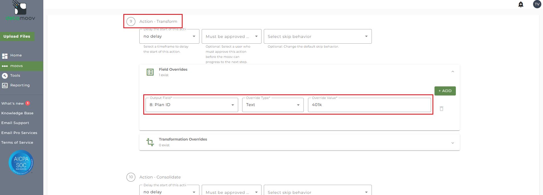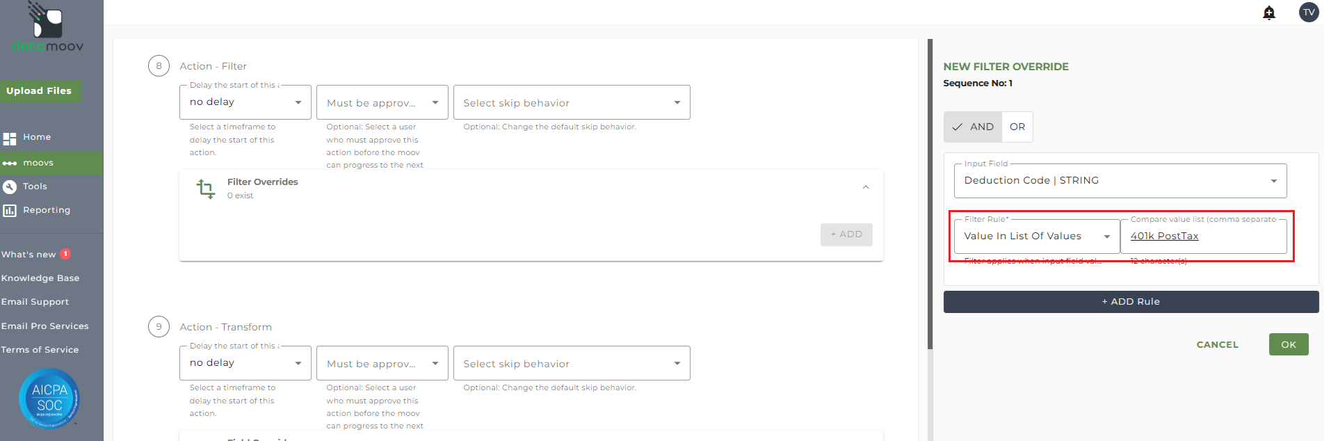 NOTE: There are 5 separate Transform steps on the Merrill Lynch (Bank of America) Deduction Feedback to PrismHR moov. Make sure are you creating the field override on step 9: - Action Transform.