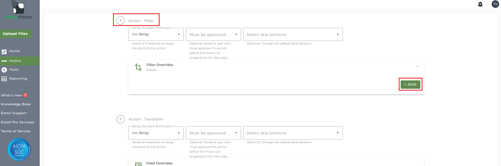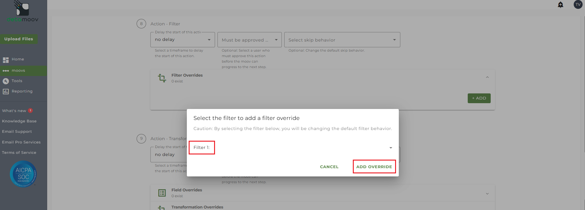 To override the filter, locate the Step 8: Action - Filter, expand the Filter Overrides panel and click ADD.