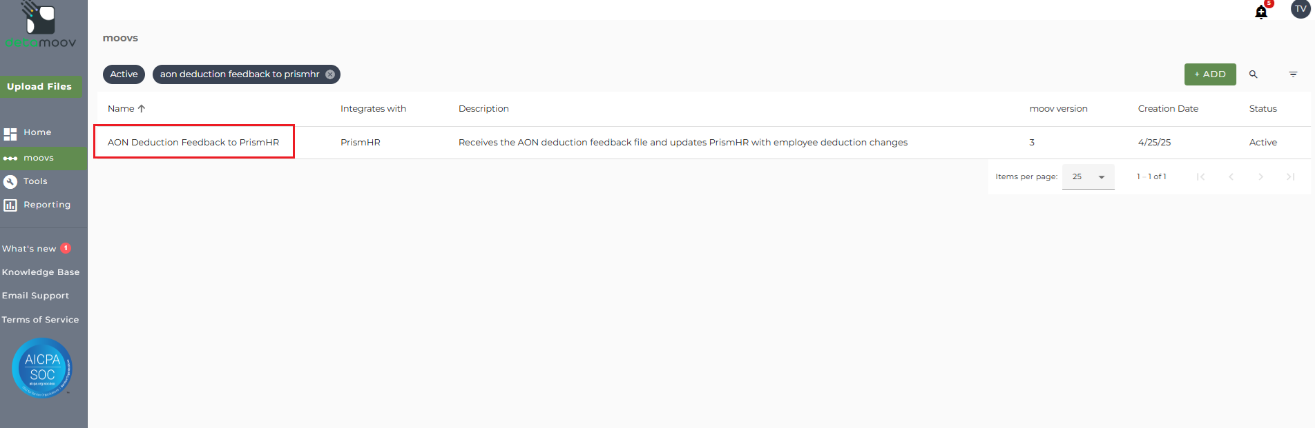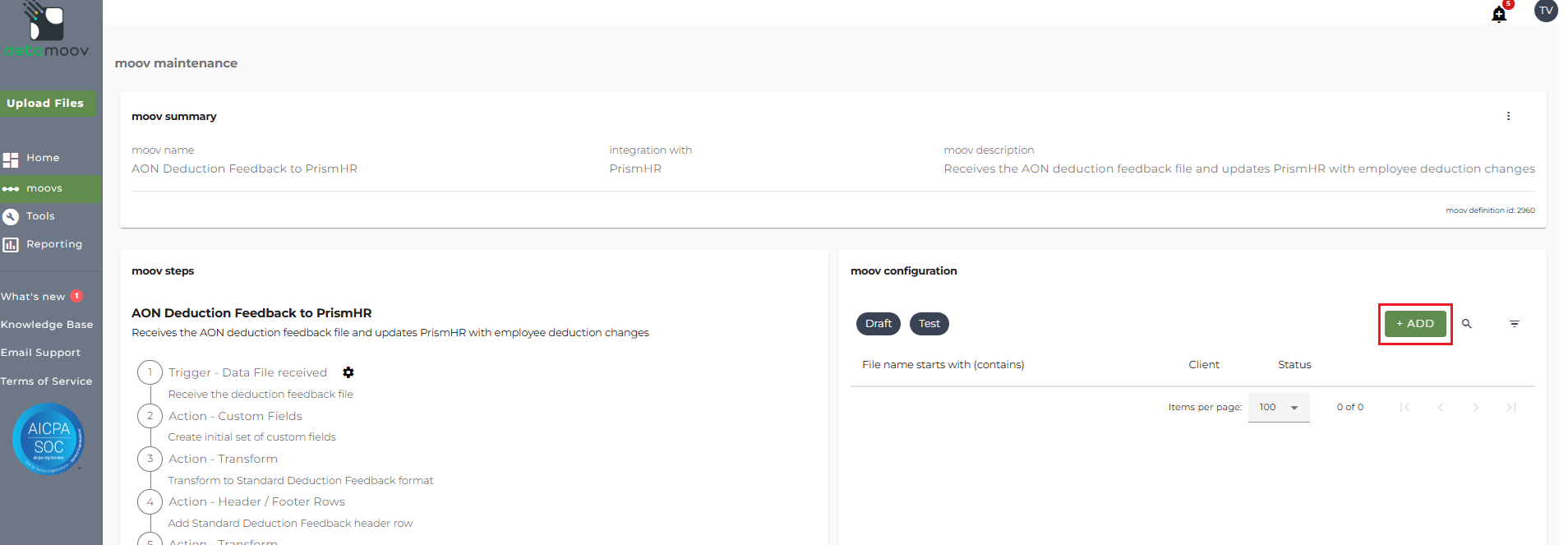 Once the AON Deduction Feedback to PrismHR moov has been added to your account, access the moovs section on the left side menu and click on the AON Deduction Feedback to PrismHR moov.