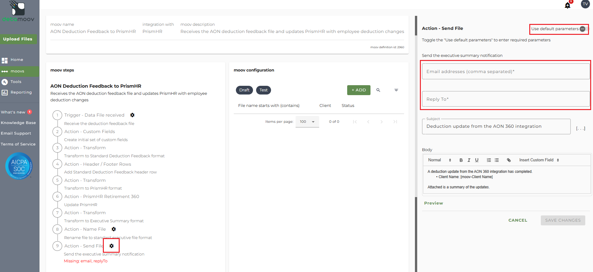 The AON Deduction Feedback to PrismHR moov provides a notification once the moov is complete with a summary of the retirement plan and loan changes that were made in PrismHR. The notification can be sent to any email address you wish and can also be configured to send to multiple email addresses.