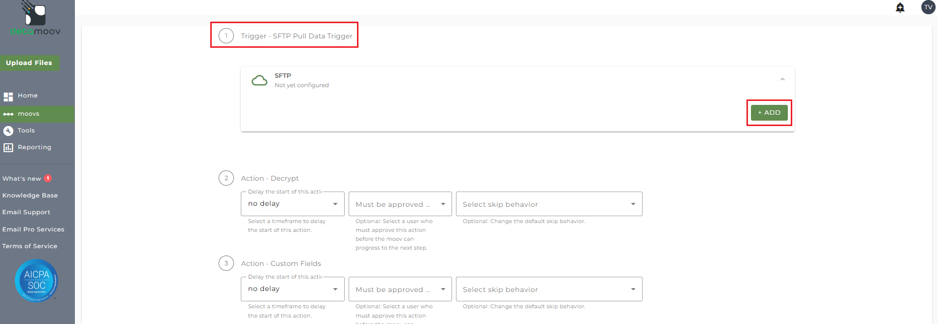 To automate the 360 integration, configure the SFTP schedule. Click the SFTP banner under the Trigger - SFTP Pull Data Trigger step and click Add.