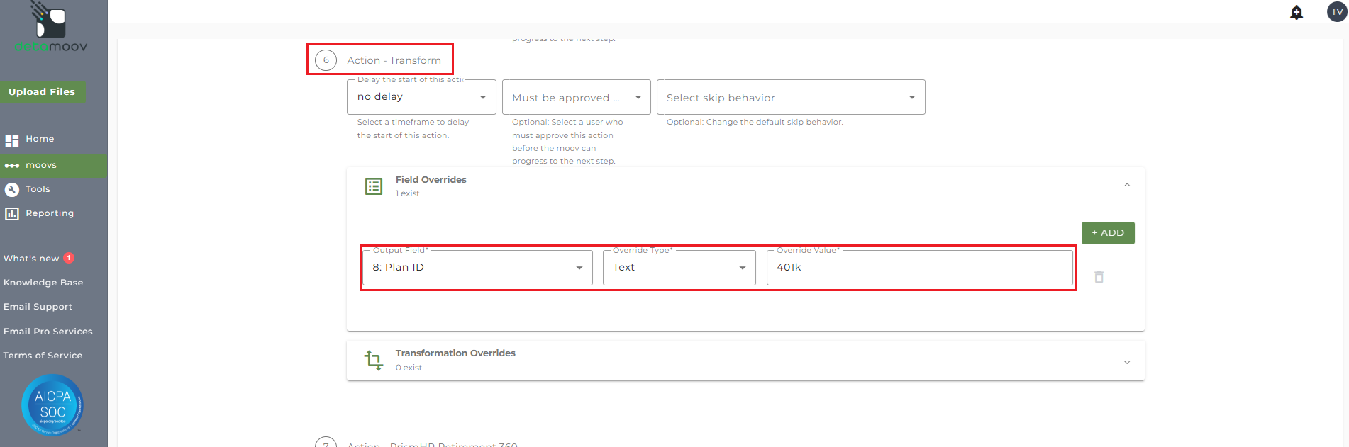 NOTE: There are 3 separate Transform steps on the AON Deduction Feedback to PrismHR moov. Make sure are you creating the field override on step 6 Action - Transform.