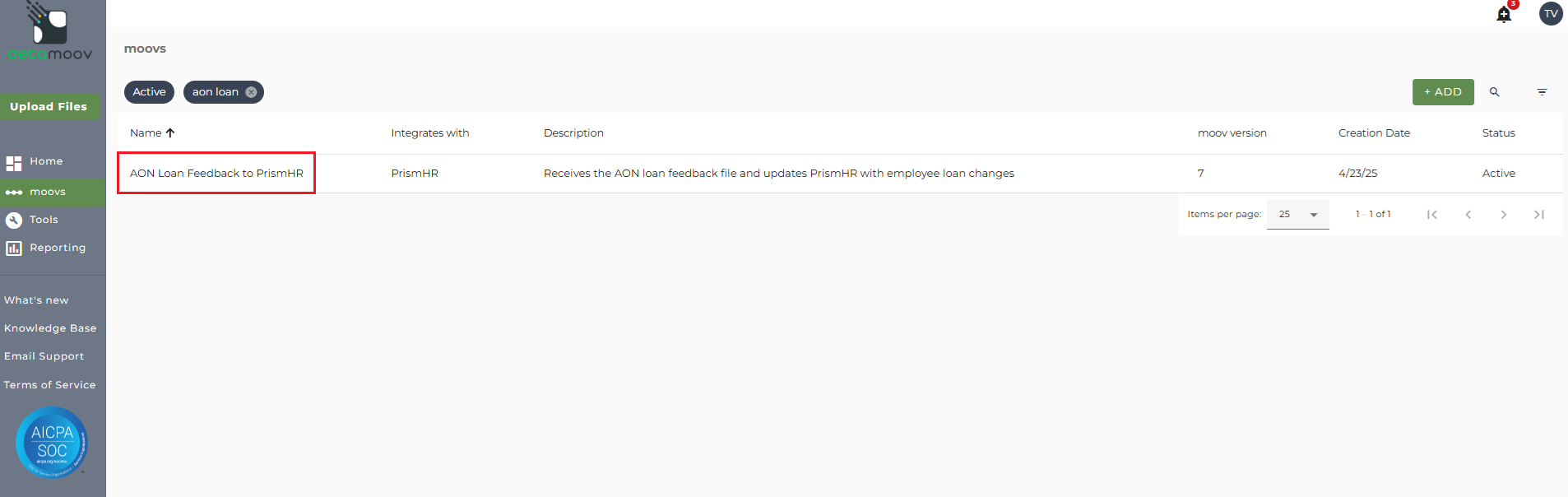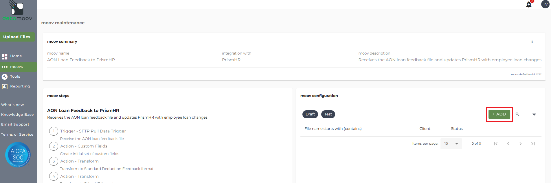 Once the AON Loan Feedback to PrismHR moov has been added to your account, access the moovs section on the left side menu and click on the AON Loan Feedback to PrismHR moov.