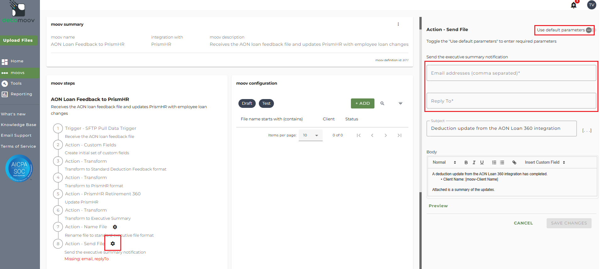 The AON Loan Feedback to PrismHR moov provides a notification once the moov is complete with a summary of the retirement plan and loan changes that were made in PrismHR. The notification can be sent to any email address you wish and can also be configured to send to multiple email addresses.