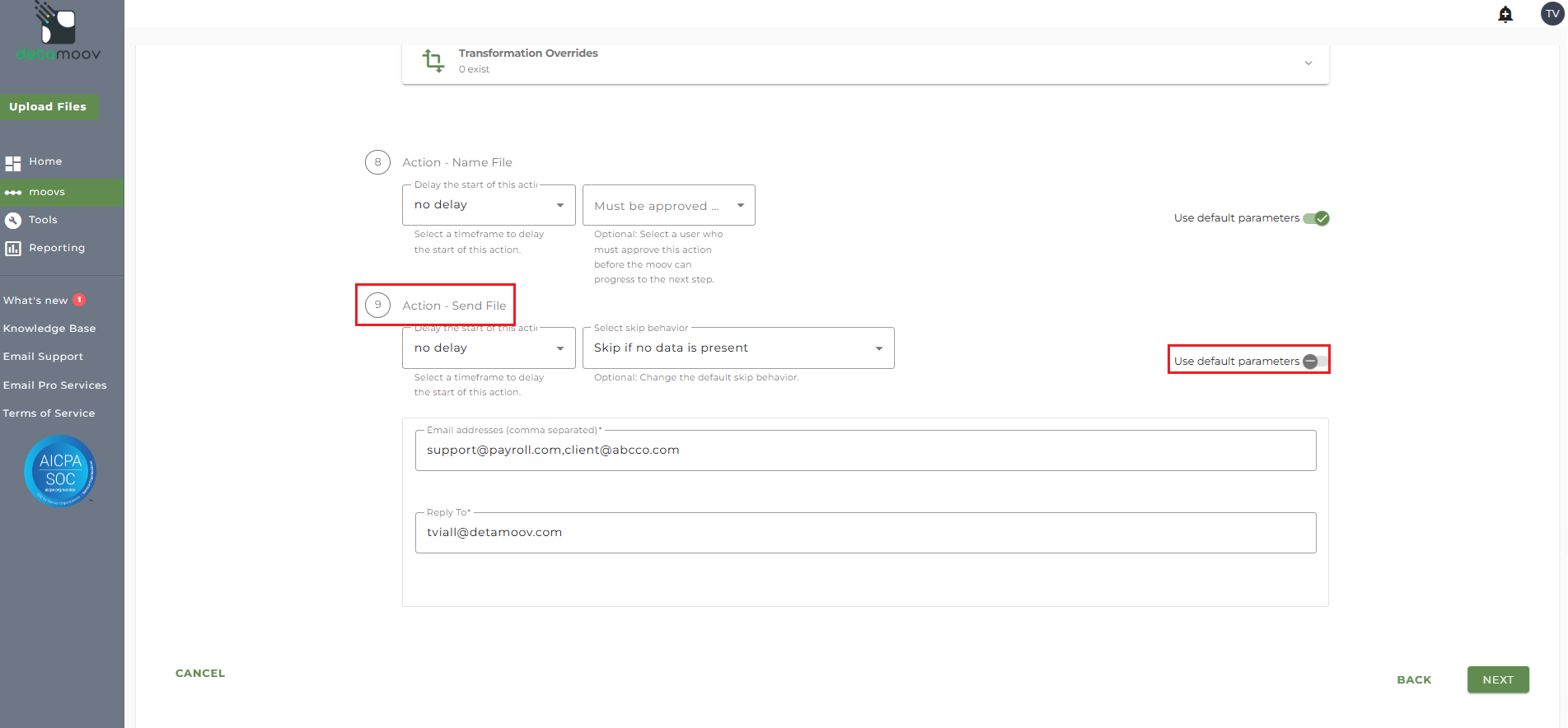 To override the send file step, locate the Action - Send File step and toggle the "Use default parameters" off and enter/remove email addresses from Email Address and Reply To fields. If you would like to enter multiple email addresses, separate them with a comma.