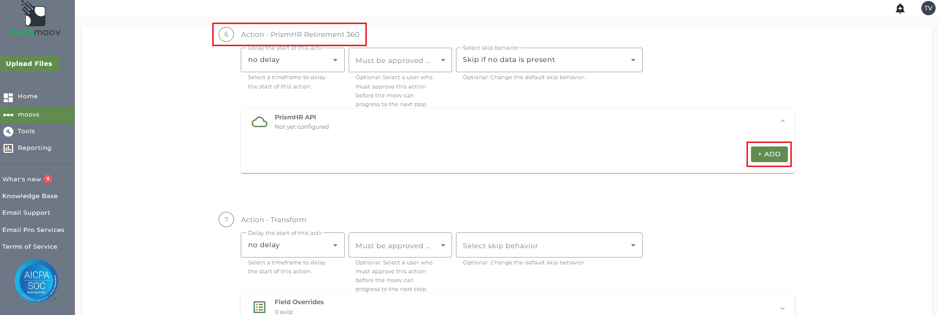 To configure the PrismHR Retirement 360 step for you client, locate the Action - PrismHR Retirement 360 step, expand the PrismHR API panel and click ADD.