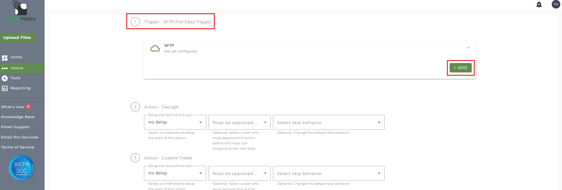 AON makes the feedback files available for your client based on their payroll frequency. To ensure that the feedback files are pulled, you will need to automate the 360 integration by configuring the SFTP schedule. Click the SFTP banner under the Trigger - SFTP Pull Data Trigger step and click Add.