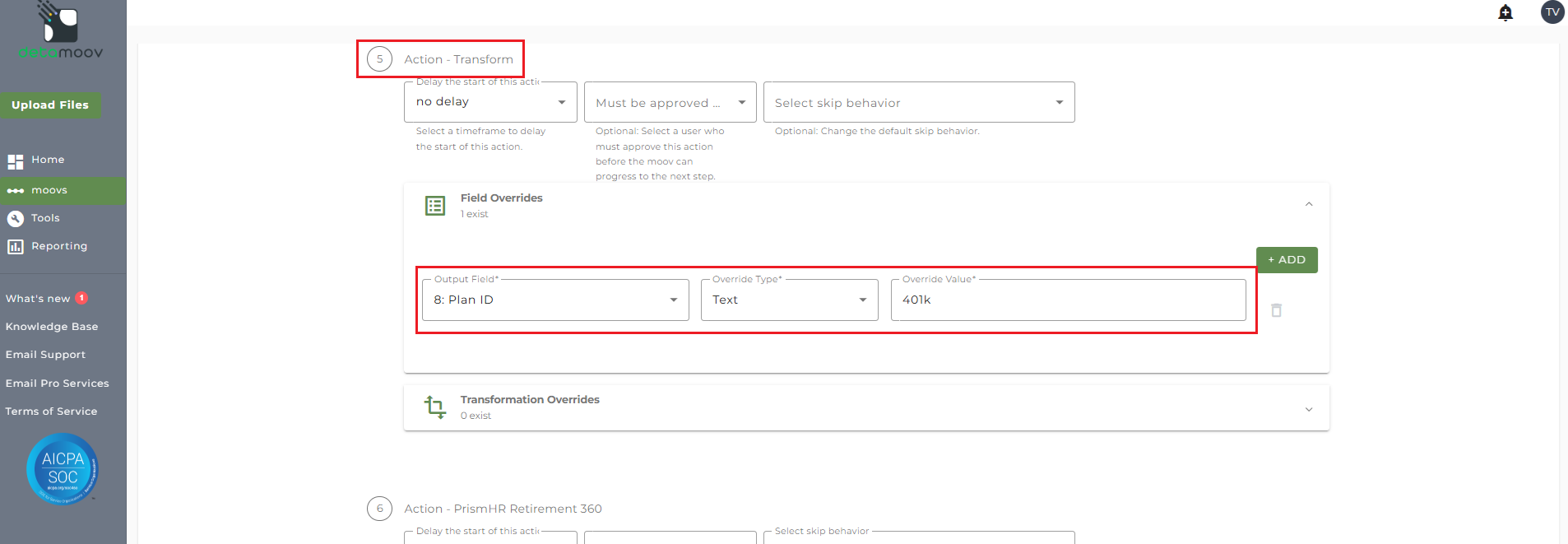NOTE: There are 3 separate Transform steps on the AON Loan Feedback to PrismHR moov. Make sure are you creating the field override on step 5 Action - Transform.