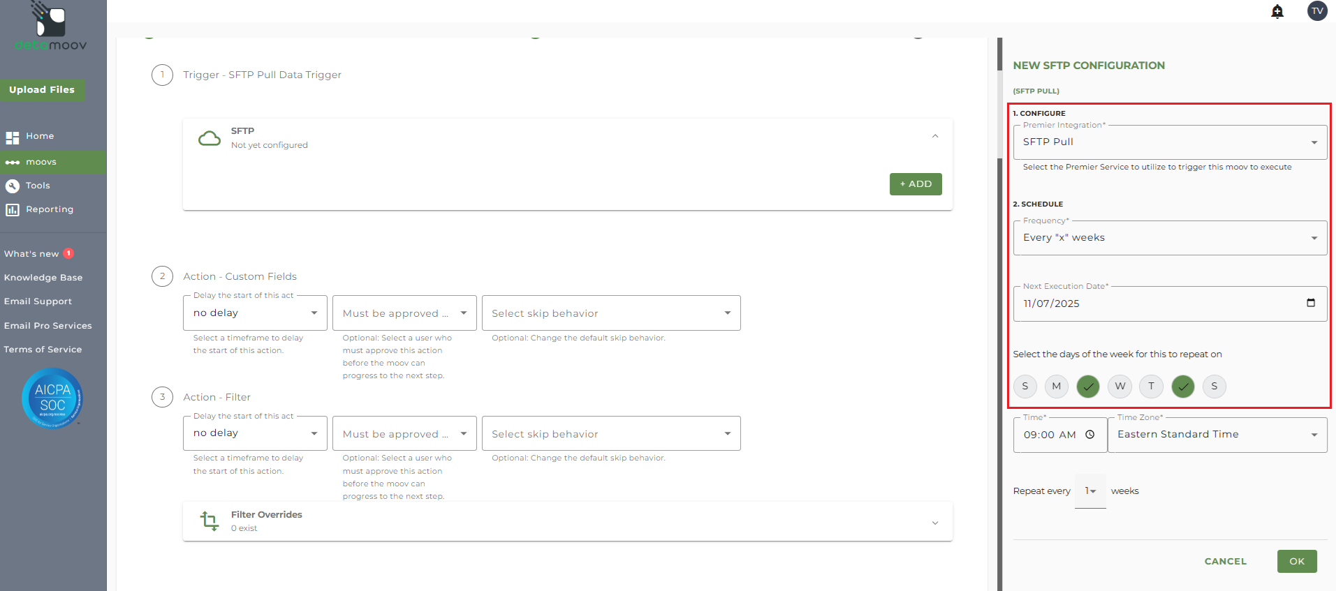 On the New SFTP Configuration section on the right, select the SFTP Pull option from the Premier Integration menu. Then select either "Every X weeks" or "On certain days of the month", depending on how often you would like detamoov to check for new deduction files. We recommend that you check for feedback files at least twice a week. In the example below, we have set up a schedule to check for files twice a week on Tuesdays and Fridays.