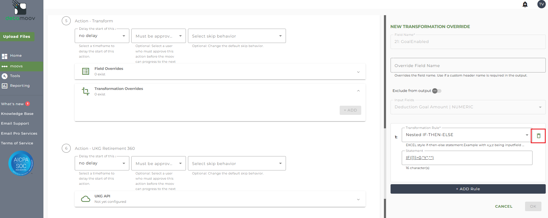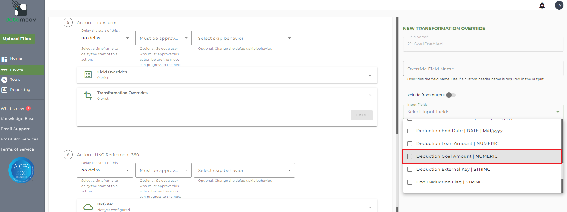 Note: The Betterment Deduction Feedback to UKG moov contains 3 separate Transform steps. The following information relates to step 5 Action - Transform only.