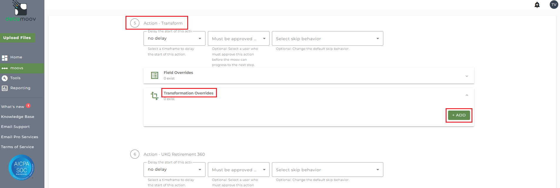 To provide a transformation override, locate step 5 - Action Transform, expand the Transformation Overrides panel and click ADD.