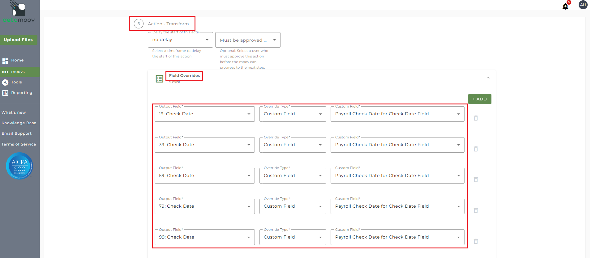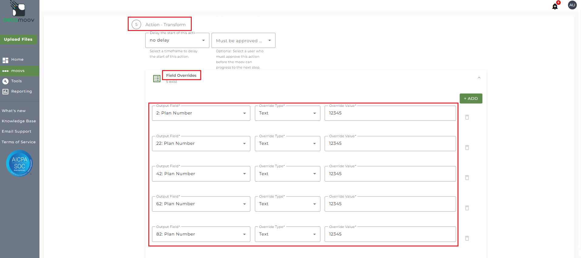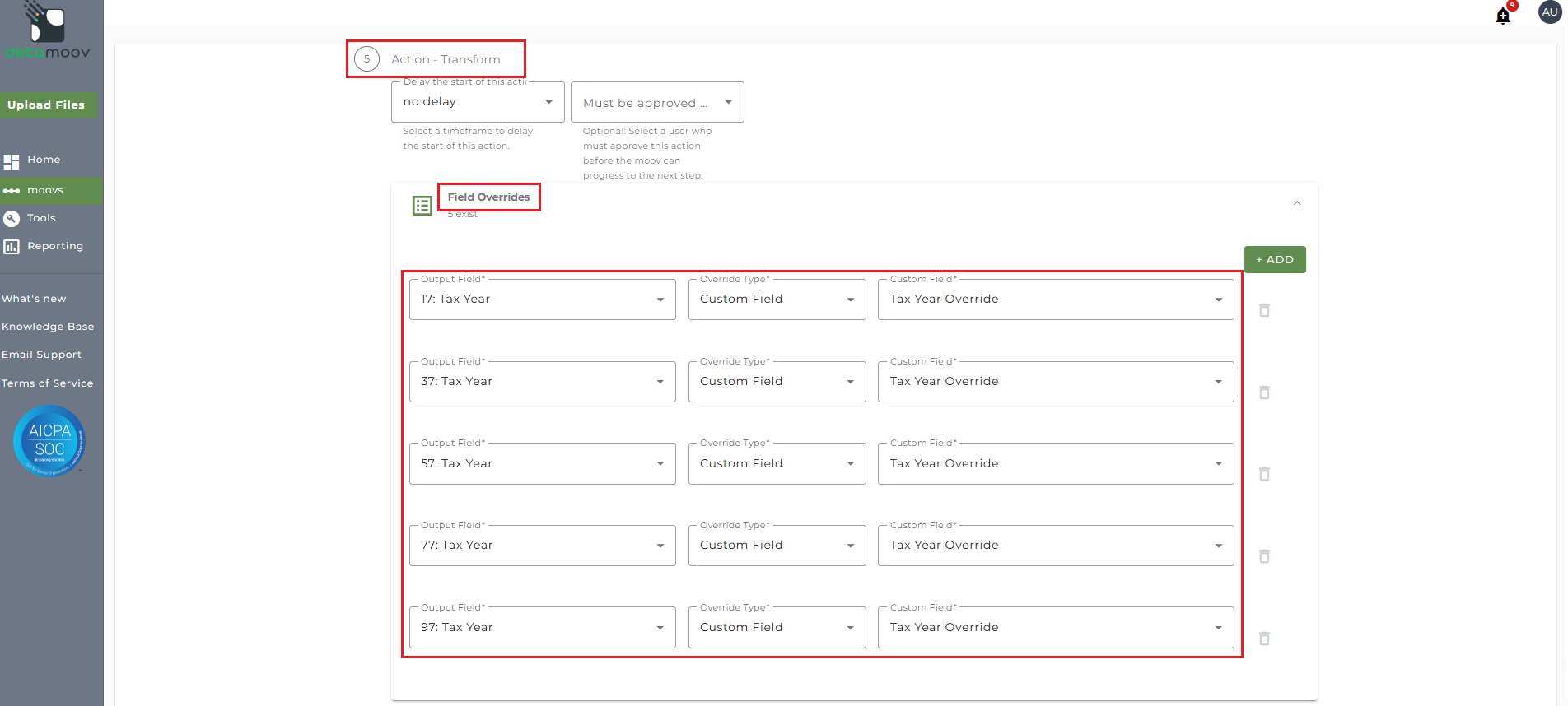 To provide a field override, locate the Action - Transform step, expand the Field Overrides panel, and click ADD. Then create a field override for the fields above.