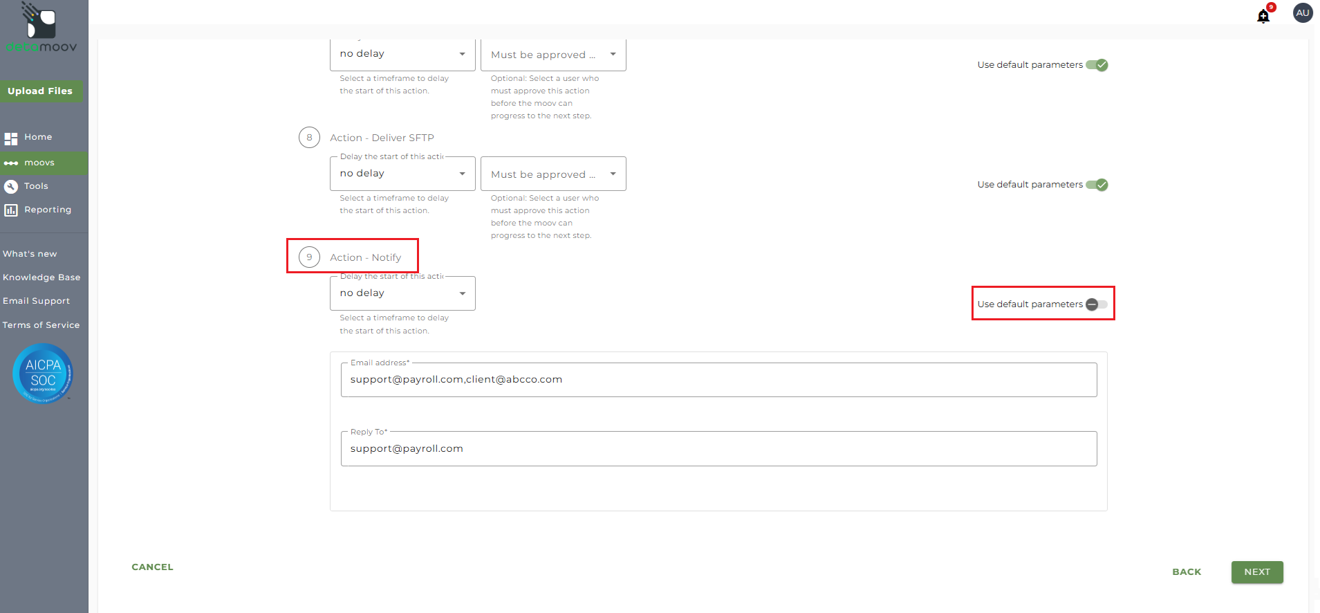 Note: these settings apply to any client configuration you set up for this specific moov. You also have the ability to configure the notification step for each client configuration if you wish to add or remove email addresses per client.