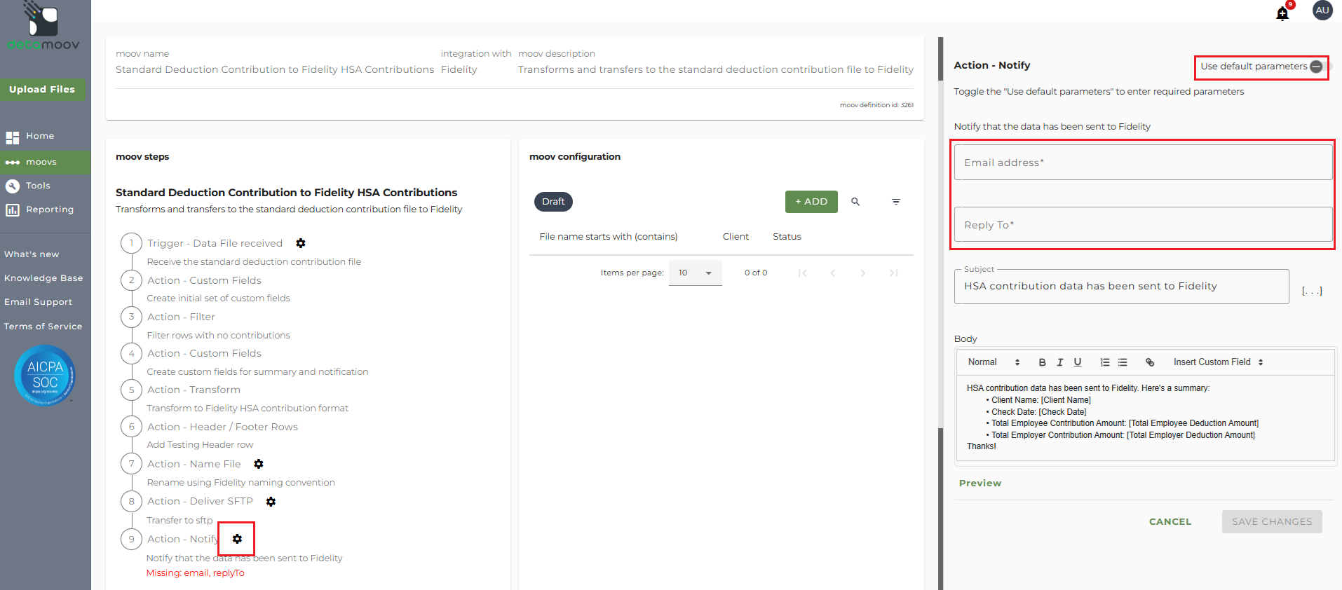 At the beginning of this article you configured the notification step for the moov to send a notification once the moov had completed. You also have the ability to configure the notification step for each client configuration if you wish to add or remove email addresses per client.