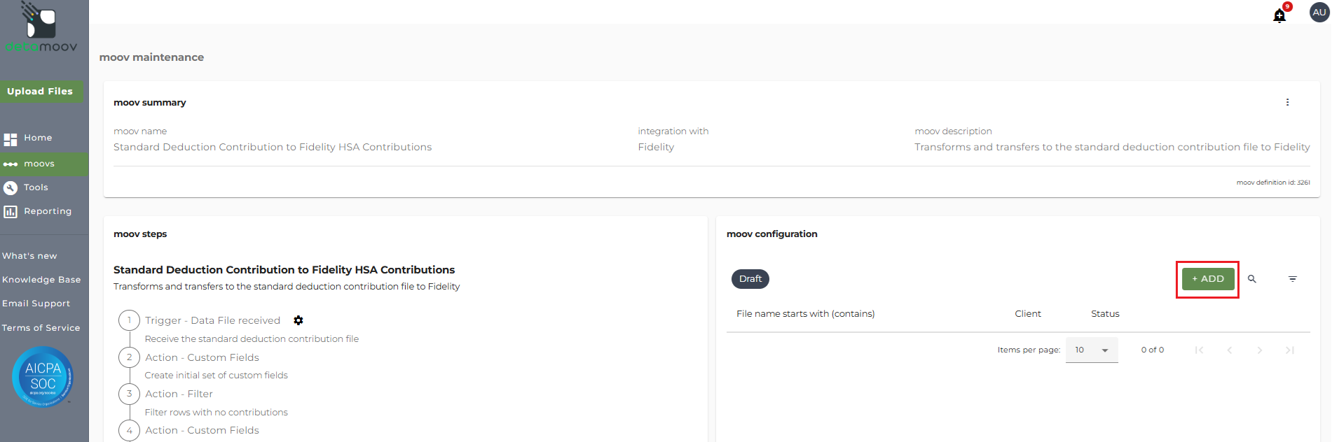 In the moov configuration section, click the Add button to add a new client to send HSA contributions to Fidelity.