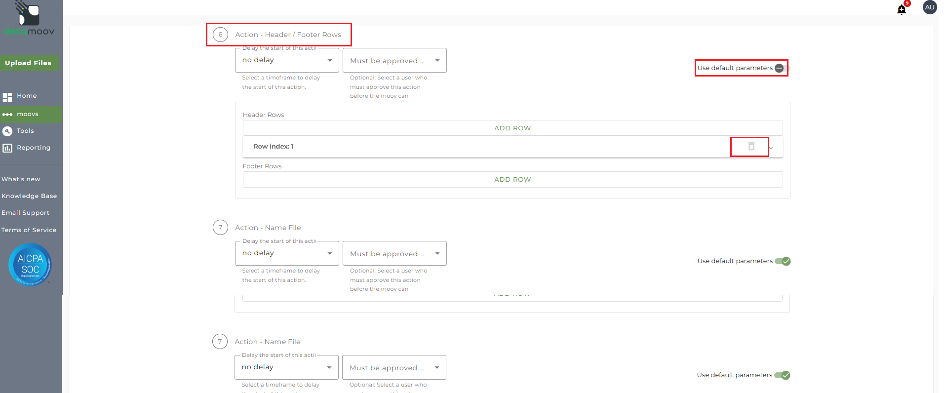 To delete the test header row, locate the Action - Header/Footer Rows step, toggle the 'use default parameters' OFF, and click on the trashcan icon for Row index: 1.