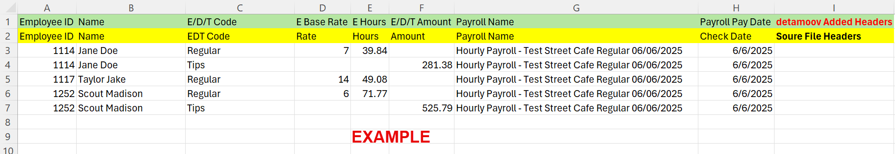 - Row 1 (green): Headers automatically added by detamoov to align with the File Definition.