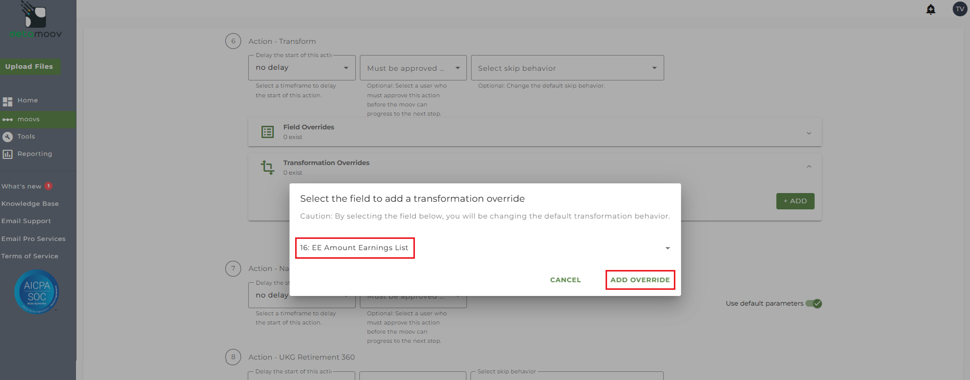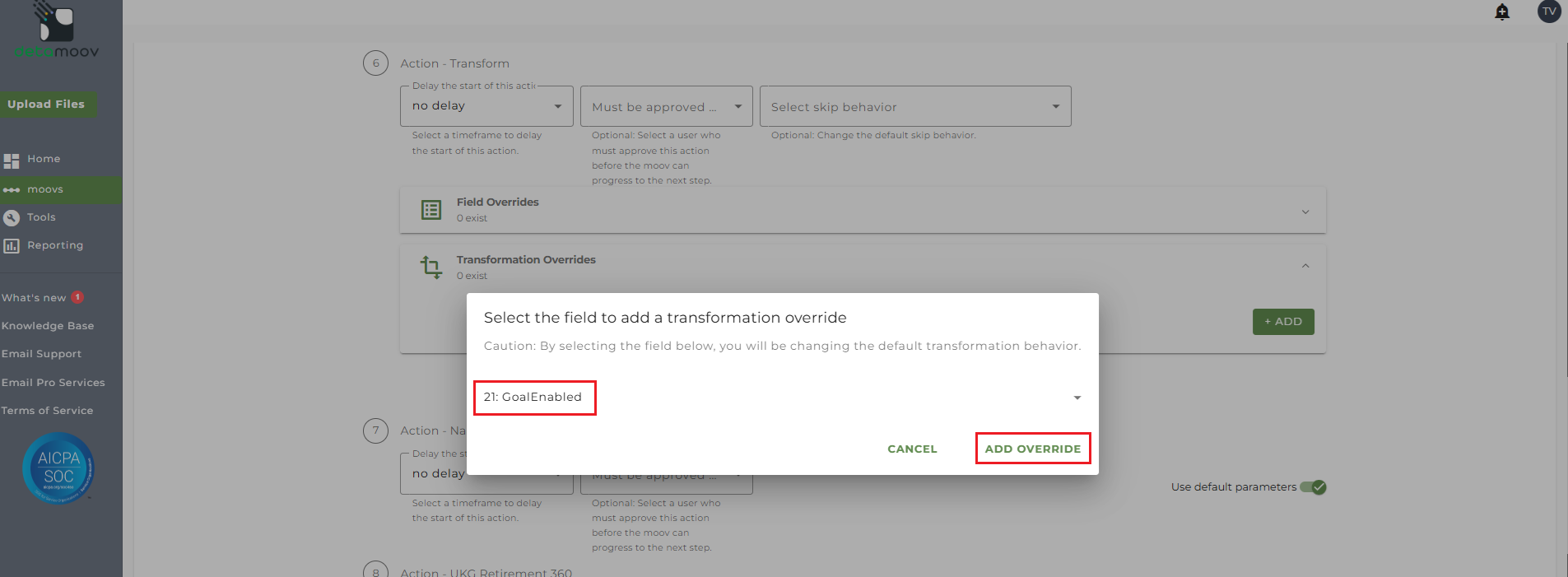 To provide a transformation override, locate step 6 Action - Transform, expand the Transformation Overrides panel and click ADD.