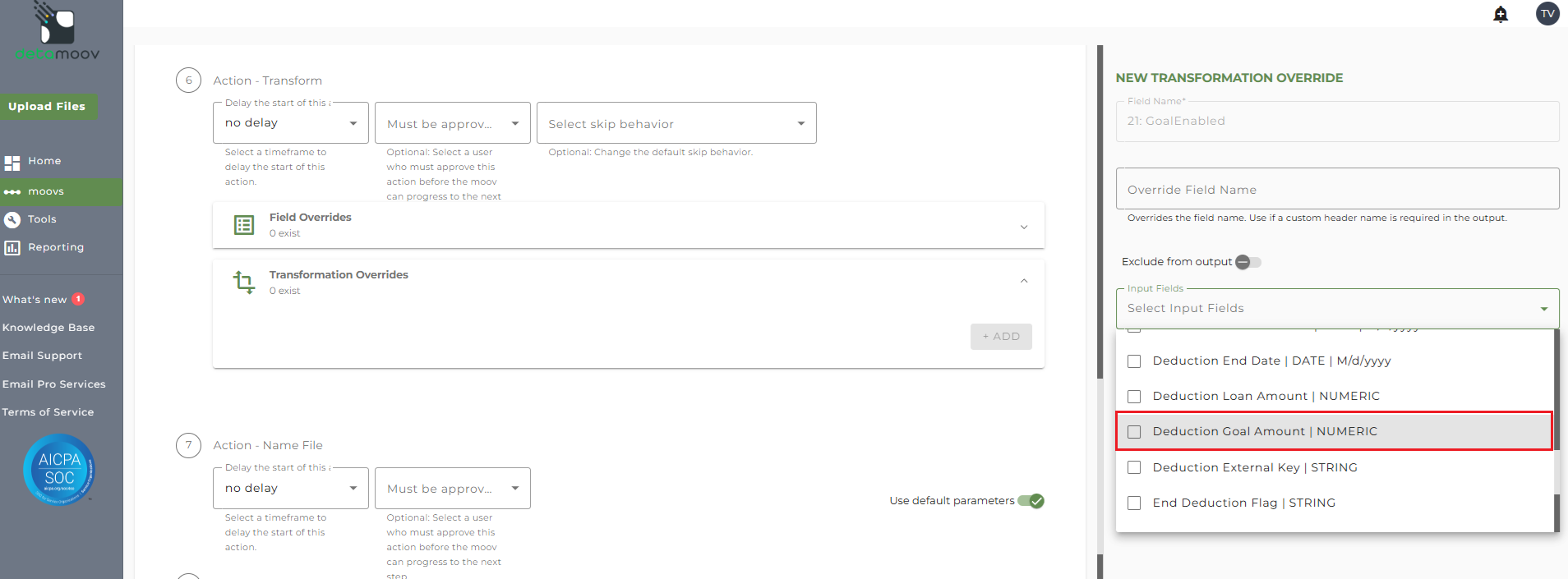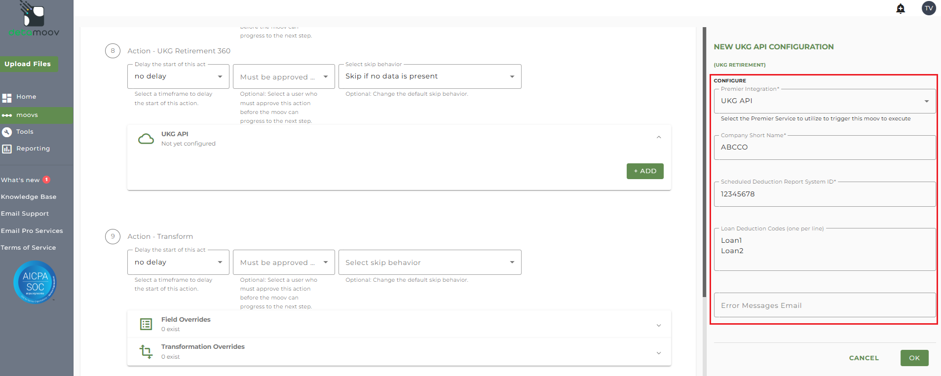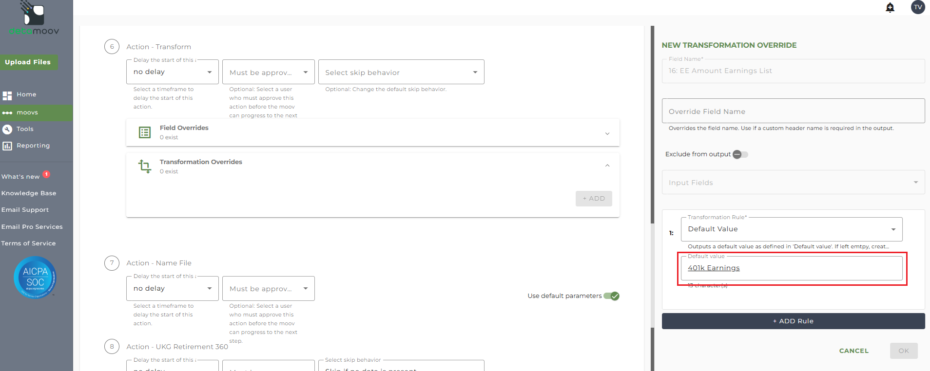 Note: The Retirement Plan Consultants Deduction Feedback to UKG moov contains 3 separate Transform steps. The following information relates to step 6 Action - Transform only.