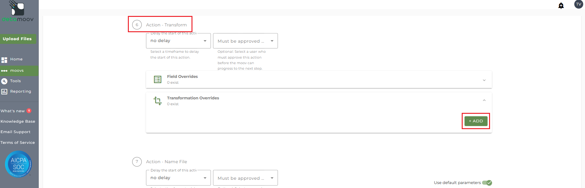 To provide a transformation override, locate step 6 Action - Transform, expand the Transformation Overrides panel and click ADD.