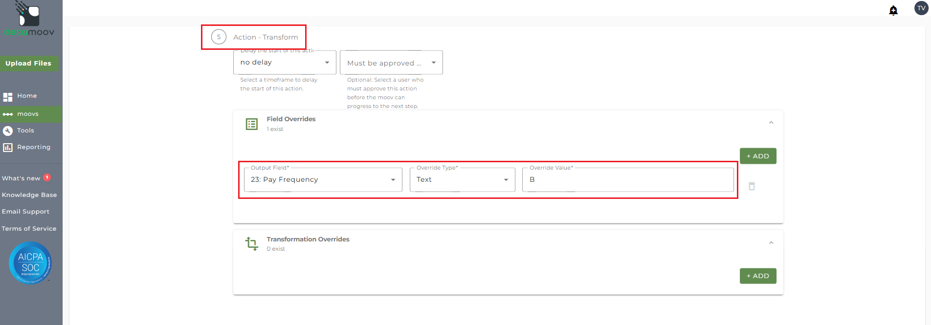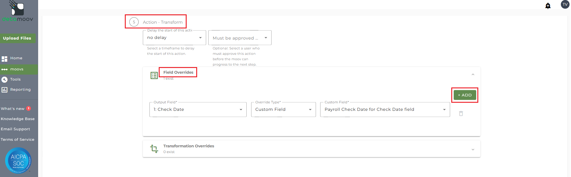 To provide the override custom fields, locate the Action - Transform step, click the Field Overrides panel, and click the Add button. Then select the appropriate field from the Output Field dropdown, change the Override Type to Custom Field, and then select the Custom field from the dropdown menu as shown below: