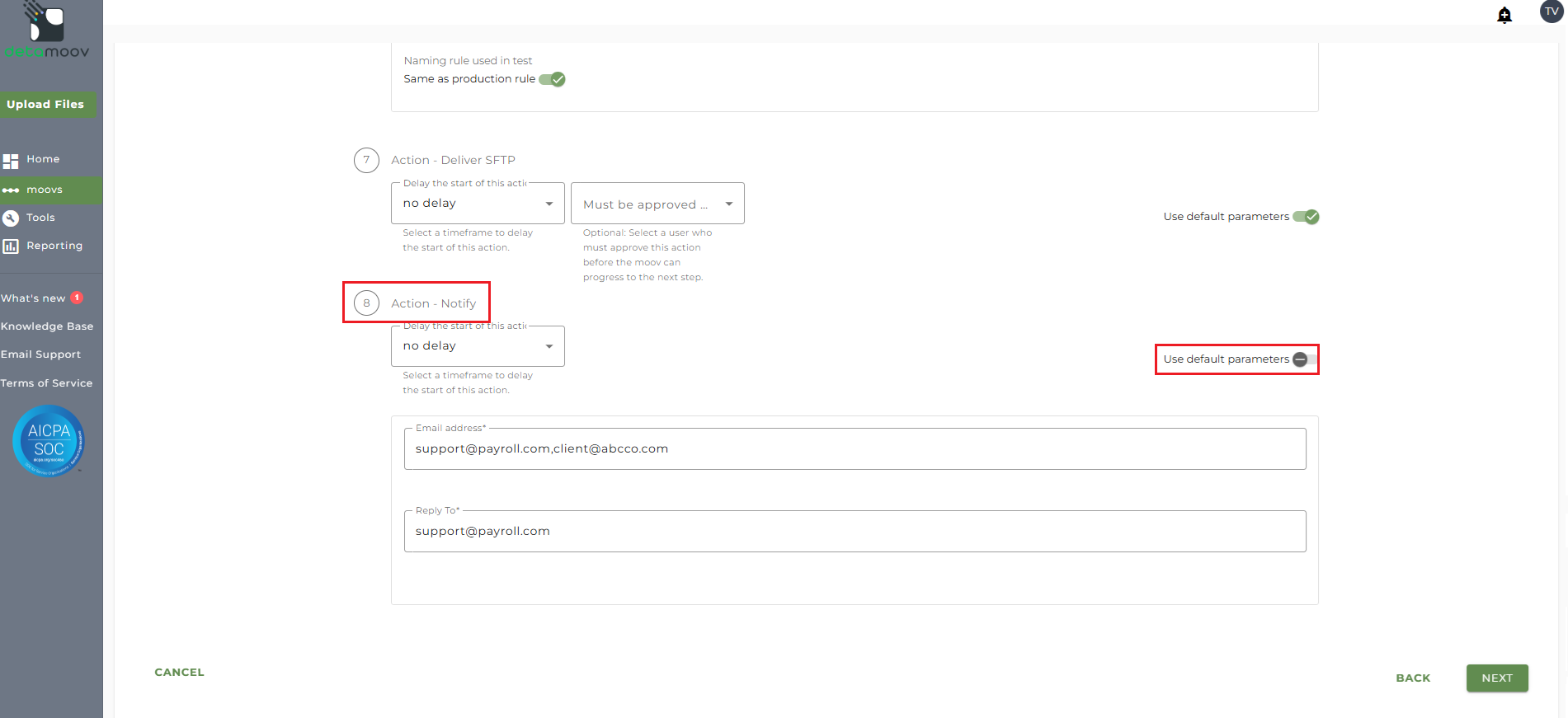 Note: these settings apply to any client configuration you set up for this specific moov. You also have the ability to configure the notification step for each client configuration if you wish to add or remove email addresses per client.