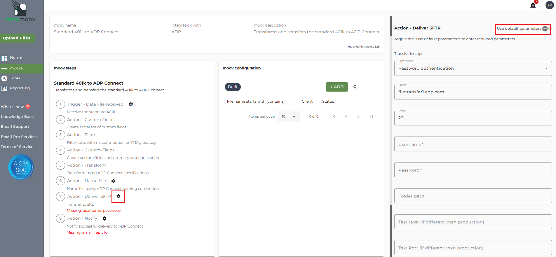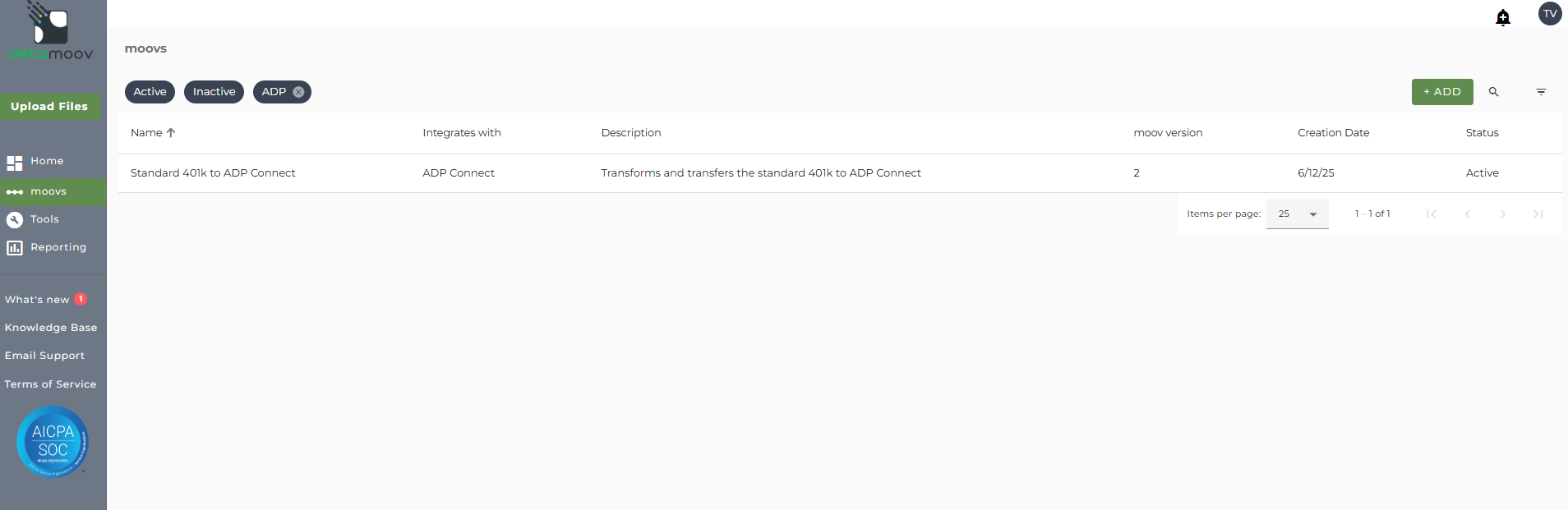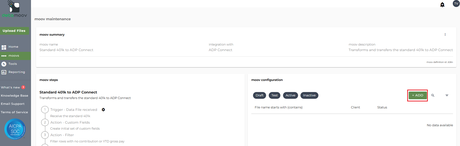 Once the Standard 401k to ADP Connect moov has been added to your account, access the moovs section on the left side menu and click on the Standard 401k to ADP Connect moov.