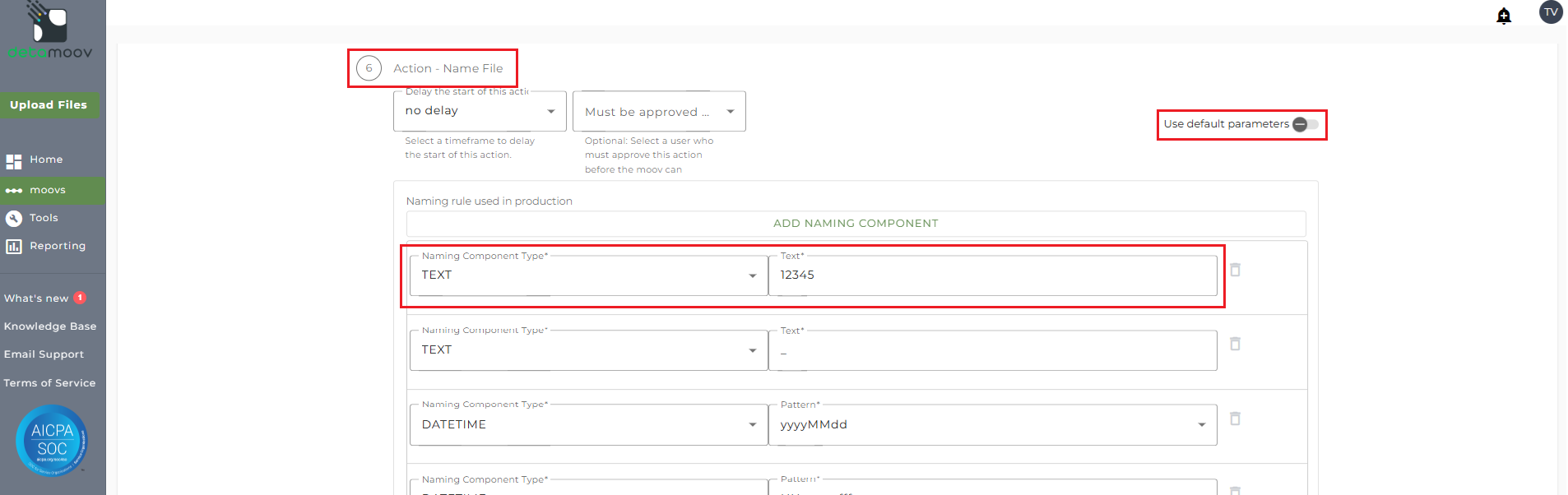To override the Name File step, locate the Action - Name File step and toggle the "Use default parameters" off. Then change the Naming Component Type of CUSTOM FIELD for the Plan ID to TEXT and enter in the ADP Plan ID in the Text field.