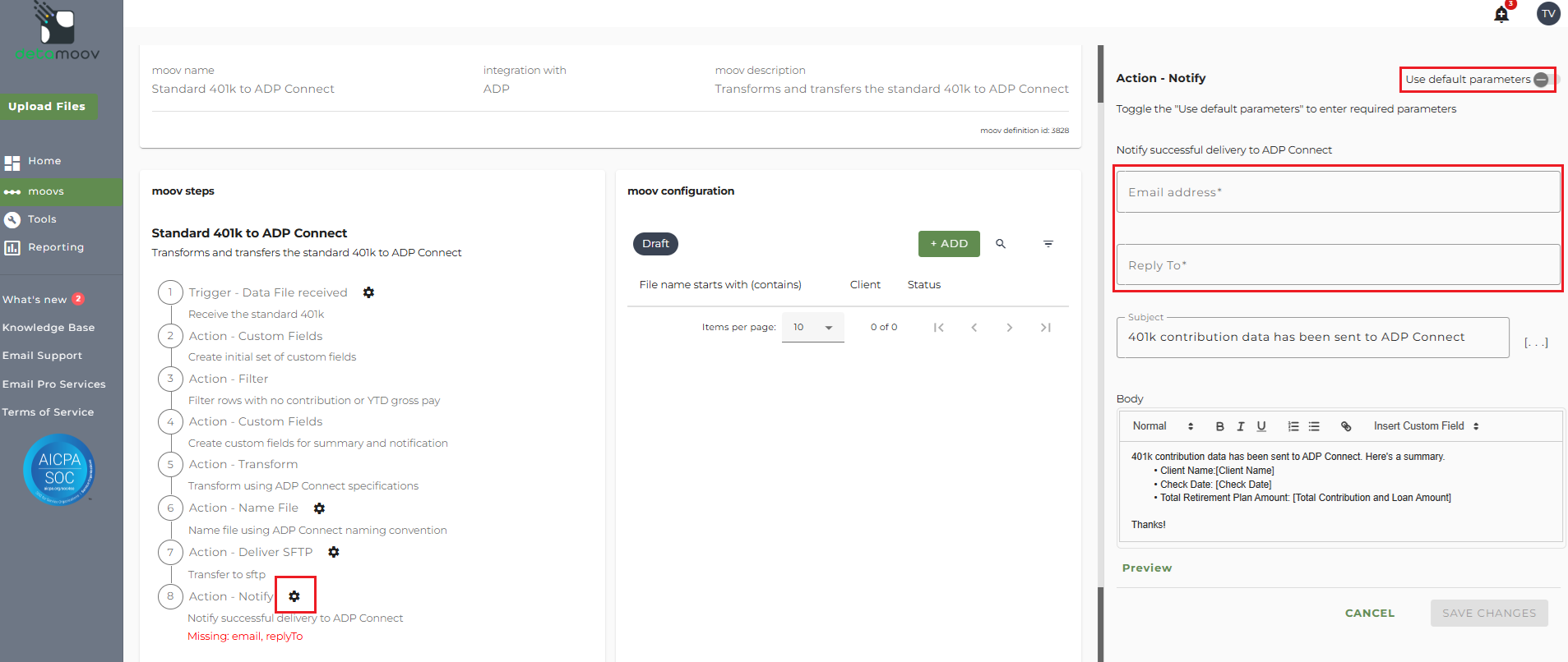 The Standard 401k to ADP Connect moov provides a notification for when the moov is complete. The notification can be sent to any email address you wish and can also be configured to send to multiple email addresses.
