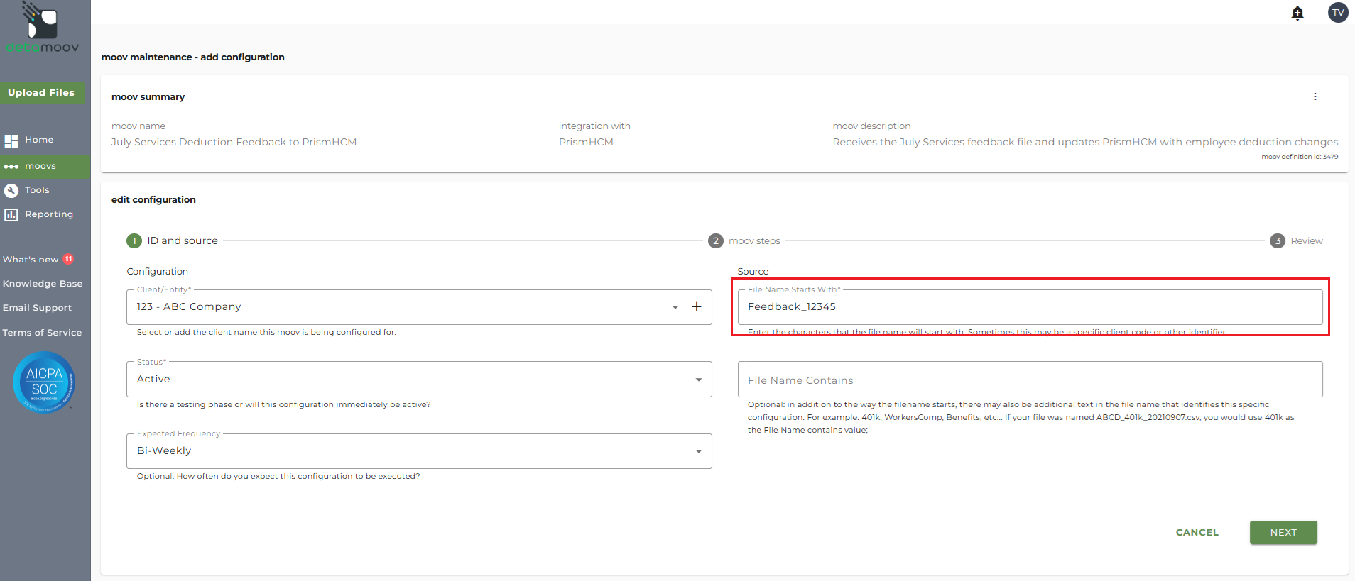 Once the July Services Deduction Feedback to PrismHCM moov has been added to your account, access the moovs section on the left side menu and click on the July Services Deduction Feedback to PrismHCM moov.