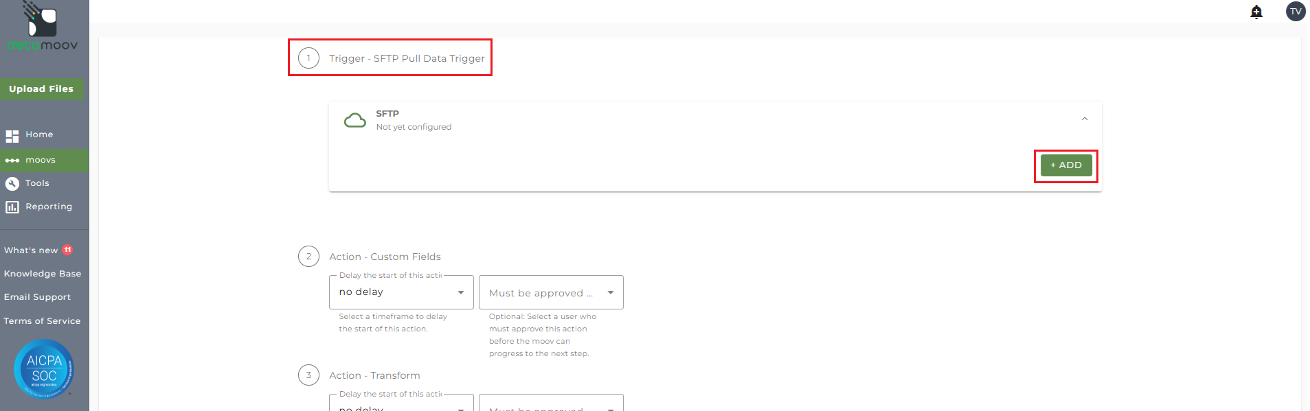 To automate the 360 integration, configure the SFTP schedule. Click the SFTP banner under the Trigger - SFTP Pull Data Trigger step and click Add.