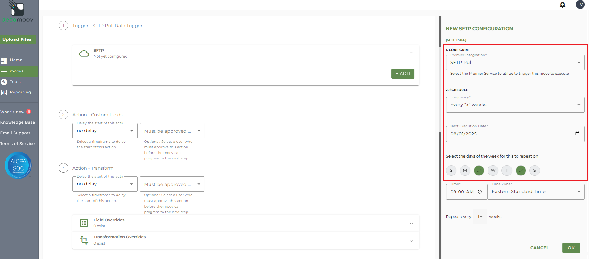 On the New SFTP Configuration section on the right, select the SFTP Pull option from the Premier Integration menu. Then select either "Every X weeks" or "On certain days of the month", depending on how often you would like detamoov to check for new feedback files. We recommend that you check for feedback files at least twice a week. In the example below, we have set up a schedule to check for files twice a week on Tuesdays and Fridays.