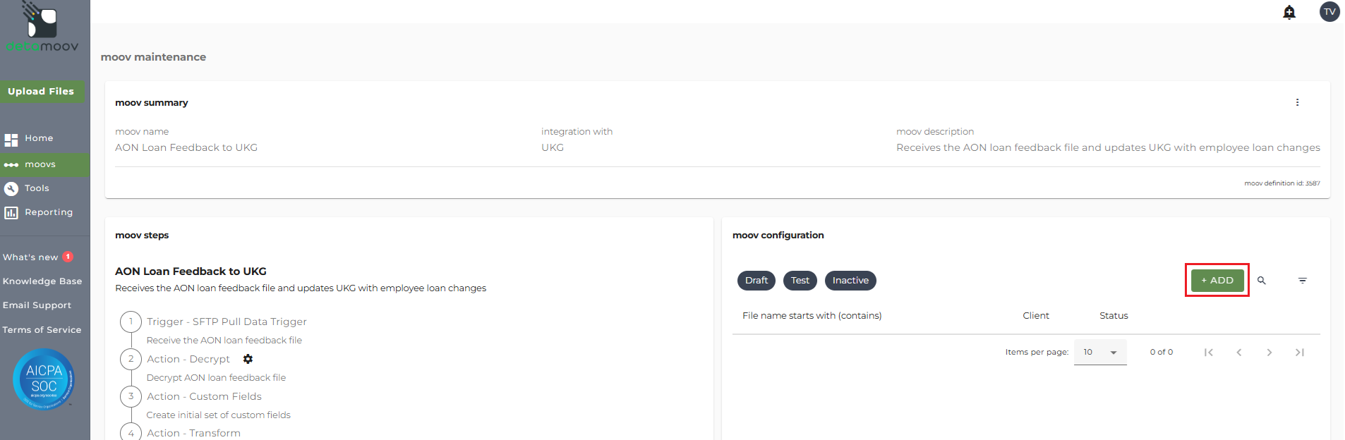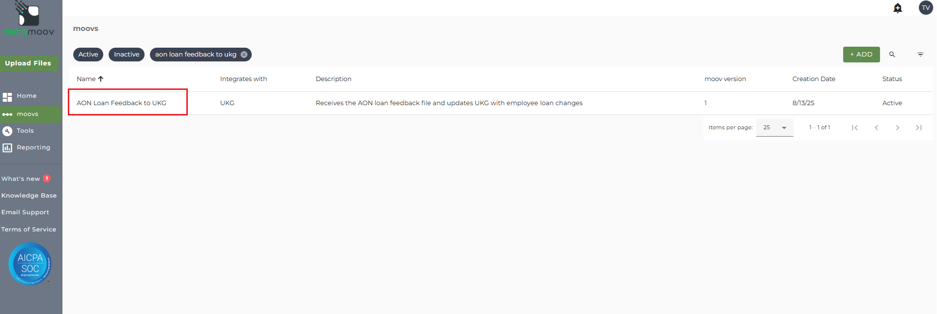 Once the AON Loan Feedback to UKG moov has been added to your account, access the moovs section on the left side menu and click on the AON Loan Feedback to UKG moov.