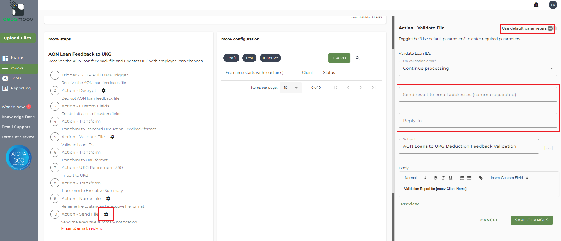 To edit the validate file step, click on the cog icon under the Action - Validate Files step on the left. Then toggle the "Use default parameters" off and enter in the email addresses you would like to receive the notification. If you would like to enter multiple email addresses, separate them with a comma. A Reply to email is also required in the event that a recipient of the notification replies to the email.