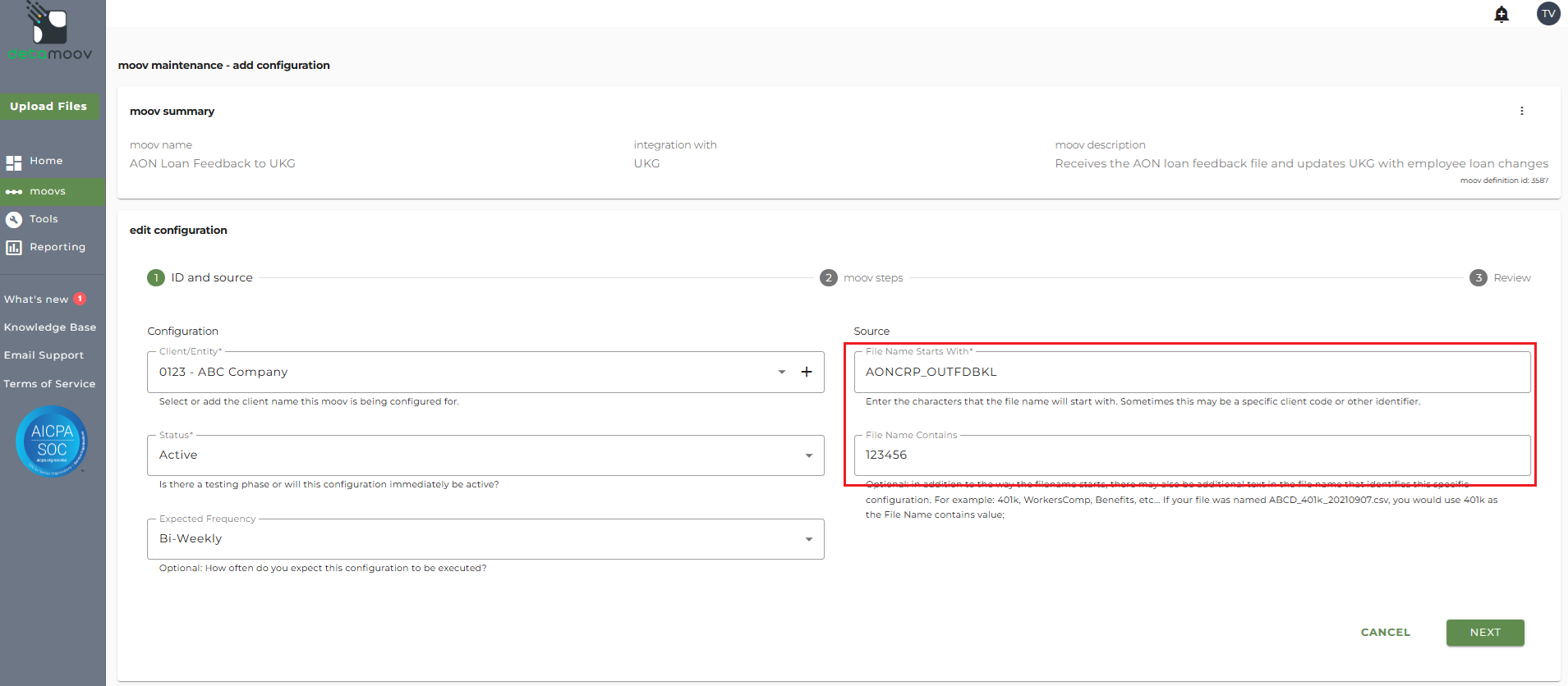 Note: make sure that the File Name Starts with field matches as this can cause issues pulling the AON feedback file and updating UKG.