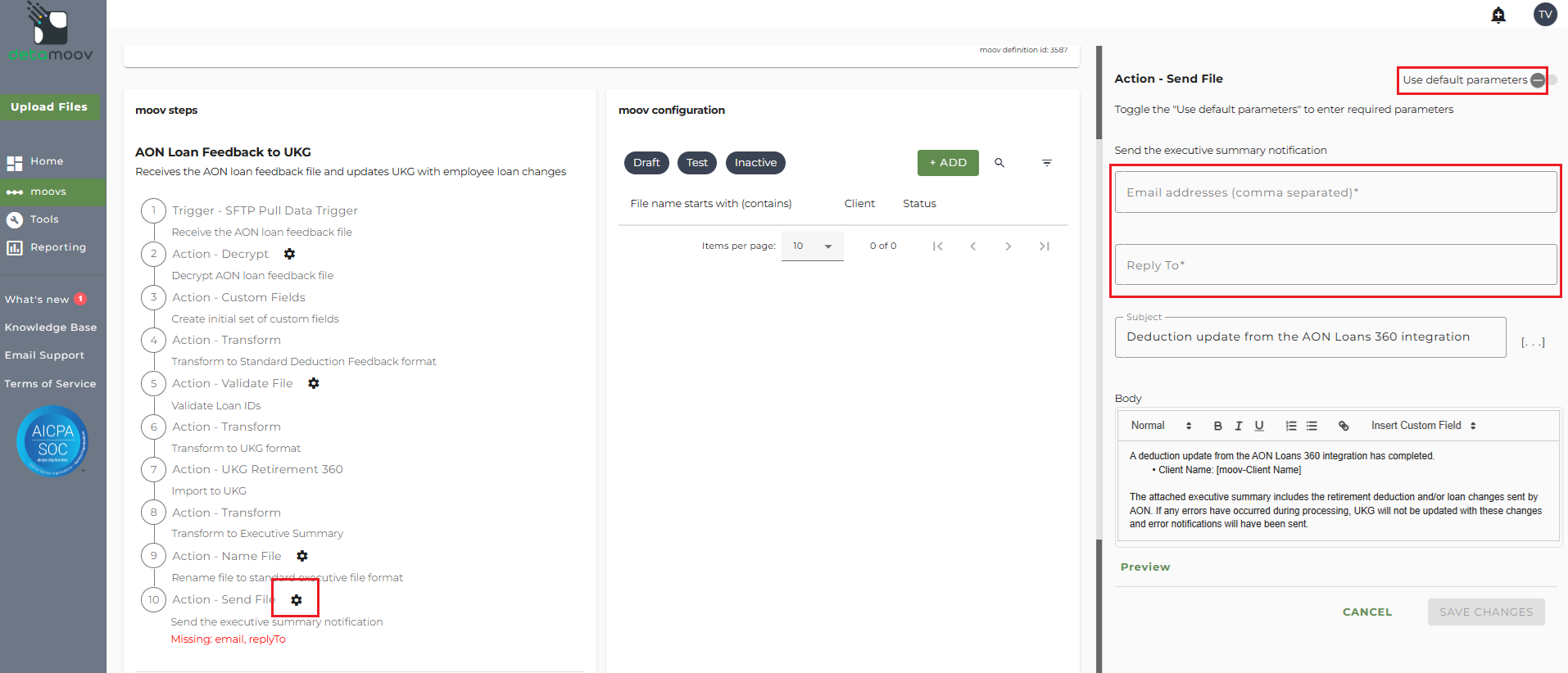 Note: these settings apply to any client configuration you set up for this specific moov. You also have the ability to configure the send file step for each client configuration if you wish to add or remove email addresses per client.