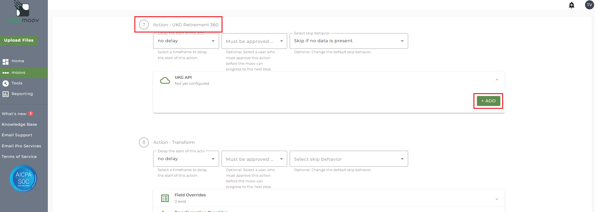 To configure the UKG Retirement 360 step for you client, locate the Action - UKG Retirement 360 step, expand the UKG API panel and click ADD.