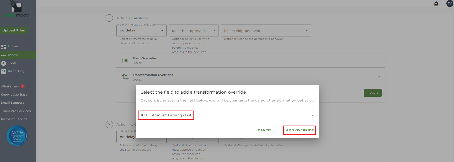 Note: The AON Loan Feedback to UKG moov contains 3 separate Transform steps. The following information relates to step 6: Action - Transform only.