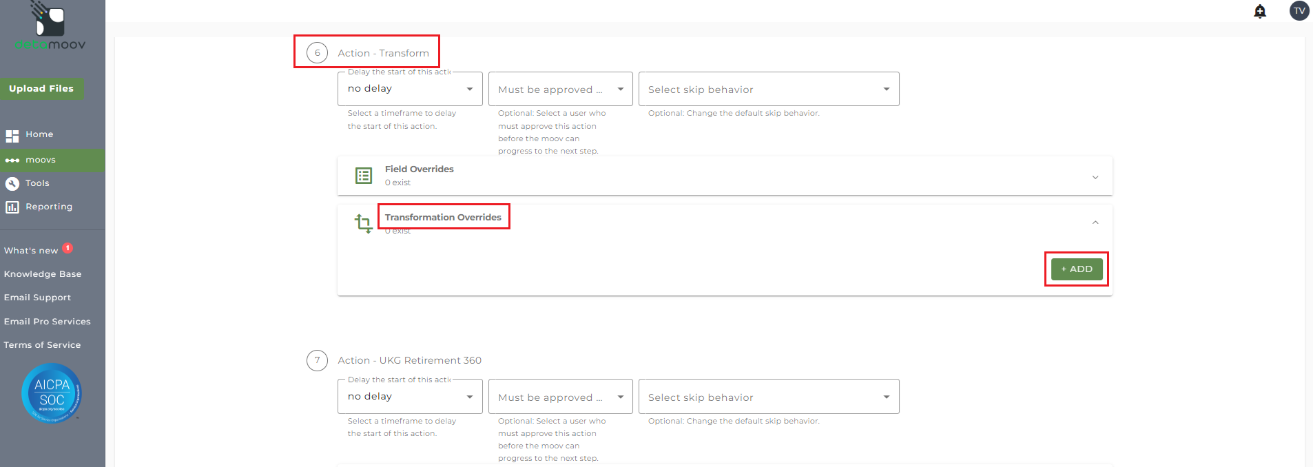 To provide a transformation override, locate step 6 - Action Transform, expand the Transformation Overrides panel and click ADD.