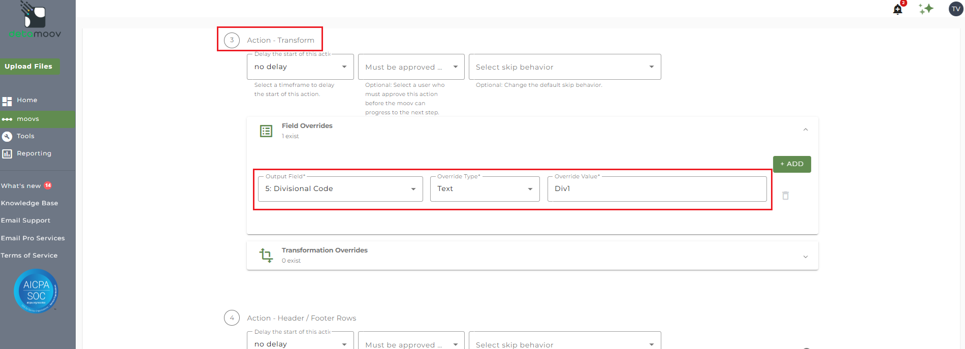 To add a Field Override, locate the Action - Transform step, expand the Field Overrides panel and click the Add button. Then select the appropriate Output field, set the Override Type to Text and enter the Override Value.