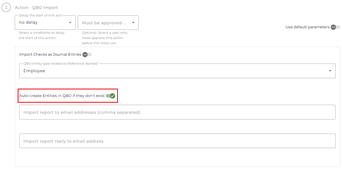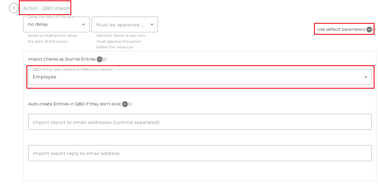 If you wish to relate the Reference Name, or NAME field in an .IIF file, to an Employee in QBO, locate the Action - QBO Import step and toggle the 'use default parameters' off. Then select the Employee option from the 'QBO entity type related to Reference Names' dropdown menu.